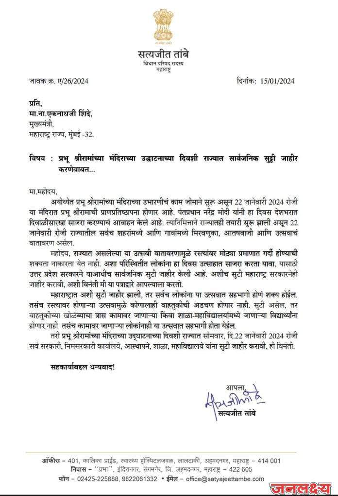 महाराष्ट्रात अशी सुट्टी जाहीर झाली, तर सर्वच लोकांना या उत्सवात सहभागी होणं शक्य होईल. तसंच रस्त्यावर होणाऱ्या उत्सवामुळे कोणालाही वाहतुकीची अडचण होणार नाही. सुट्टी असेल, तर वाहतुकीच्या खोळंब्याचा त्रास कामावर जाणाऱ्या किंवा शाळा-महाविद्यालयांमध्ये जाणाऱ्या विद्यार्थ्यांना होणार नाही. तसंच कामावर जाणाऱ्या लोकांनाही या उत्सवात सहभागी होता येईल. ही गोष्ट लक्षात घेऊन सोमवार, २२ जानेवारी २०२४ रोजी सर्व सरकारी, निमसरकारी कार्यालये, आस्थापने, शाळा, महाविद्यालये यांना सुट्टी जाहीर करावी, असेही आमदार सत्यजीत तांबेंनी पत्रात म्हटले आहे.