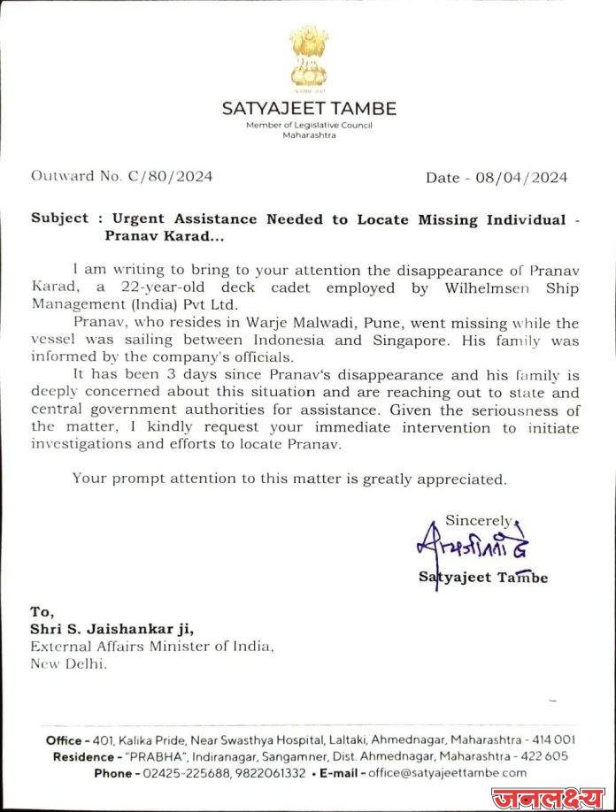 – परराष्ट्र व्यवहारमंत्री एस. जयशंकर यांना पत्राद्वारे केली विनंती