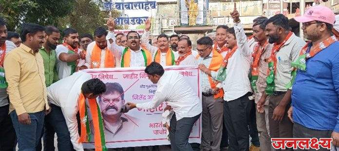 महामानव भारतरत्न डॉ.बाबासाहेब आंबेडकरांचा अवमान केल्याचा आरोप करत आमदार जितेंद्र आव्हाड यांचे विरोधात भारतीय जनता पार्टी पाचोरा तर्फे आज दिनांक 30 मे गुरुवार रोजी सायंकाळी 6 वाजता त्यांचे प्रतिमेस डॉ. बाबासाहेब आंबेडकर यांचे पुतळ्या समोर जोडो मारो आंदोलन करण्यात आले. यावेळी पाचोरा पोलिसांनी चोखबंदोबस्त ठेवला होता. आंदोलनासाठी उपस्थित पदाधिकारी. कृ.उ.बा.समिती मा.सभापती सहकार आघडी जिल्हाध्यक्ष सतिष बापू शिंदे, मा.पं.स.सभापती मा तालुकाध्यक्ष सुभाष पाटील,मा.पं.स.सभापती सरचिटणीस बन्सीलाल पाटील,जिल्हा उपाध्यक्ष प्रदिप पाटील,शहराध्यक्ष दिपक माने, तालुका सरचिटणस,मुकेश पाटील,विधानसभा क्षेत्र प्रमुख संजय पाटील,शहर सरचिटणीस समाधान पाटील,जगदिश पाटील, युवा मोर्चा तालुकाध्यक्ष करण पवार युवा मोर्चा शहराध्यक्ष योगेश ठाकुर, विजय पाटील,विनोद शेजवळ, महेश गौड,संदीप पाटील,बबलू मराठे, भैय्या पाटील, सागर महाजन, विनोद पाटील शरद पाटील, गौरव पाटील, रोहन मिश्रा, गोकुळ दारकुंडे,रवींद्र देवरे, सनी जगताप, आकाश लांडगे,भरत पाटील,रवी चव्हाण,राजू चव्हाण, विशाल मोरे वाल्मीक माने, हिरामण भोसले, किशोर बागुल अक्षय मंदाडे, अमोल नाथ, रामा जठार ,सुमित निकम,लखन काळे, करण गवळी, विशाल पाटील,आकाश मोरे, नानू गायकवाड, चेतन मराठे,आदी पदाधिकारी यावेळी मोठया संख्येने उपस्थित होते.