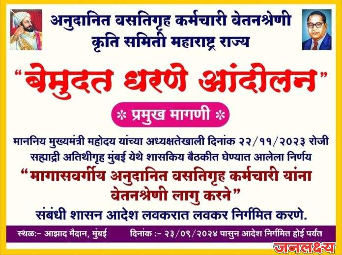 अनुदानित वसतिगृह कर्मचारी वेतनश्रेणी कृती समिती महाराष्ट्र राज्य मार्फत दिनांक 23 सप्टेंबर पासून मुंबई येथे आझाद मैदानावर बेमुदत धरणे आंदोलन