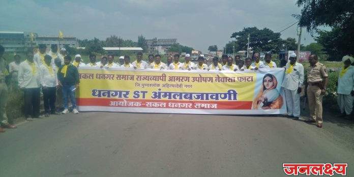 (सुनिल नजन/ “चिफब्युरो” अहमदनगर जिल्हा) सरकारने संपूर्ण महाराष्ट्रातील धनगर समाजाला एसटी प्रमाणपत्र देण्याची अंमलबजावणी करण्यासाठी आणि पंढरपूर, लातूर, नेवासाफाटा, वैजापूर, जालना, पुणे, सांगली, कोल्हापूर या ठिकाणी उपोषणाला बसलेल्या धनगर समाजाच्या कार्यकर्त्यांच्या या उपोषणाला पाठिंबा देण्यासाठी भाजपाचे आमदार आणि धनगर समाजाचे नेते गोपिचंद पडळकर यांनी संपूर्ण महाराष्ट्रात तेवीस तारखेला जोरदार निदर्शने,रास्ता रोको, करण्यासाठीचे आवाहन केले आहे. या आवाहनाला प्रतिसाद देत महाराष्ट्रातील सर्वात अगोदर पहिला मेंढरासह रास्ता रोको एल्गार मोर्चा अहमदनगर जिल्ह्यातील नेवासाफाटा येथे काढण्यात आला होता. भाजपचे नेते अशोक कोळेकर आणि नेवासा तालुक्यातील सकल धनगर समाजातील सर्व कार्यकर्ते यांच्या वतीने या एल्गार मोर्चाचे आयोजन करण्यात आले होते. धनगर समाजासाठी एसटी प्रमाणपत्राची त्वरीत अंमलबजावणी करण्यासाठी आणि उपोशनार्थींना पाठिंबा देण्यासाठी हे आंदोलन करण्यात आले. सरकारने या आठवडा भरात एसटी प्रमाणपत्राच्या घोषणेची प्रत्यक्ष अंमलबजावणी न केल्यास प्रवरा संगम येथील गोदावरीच्या नदी पात्रात पुलावरून उड्या टाकून जलसमाधी घेण्यासाठीचा ईशारा नेवासाफाटा येथे उपोषणाला बसलेल्या प्रल्हाद सोरमारे(संभाजी नगर),बाळासाहेब कोळसे(पाथर्डी), राजूमामा तागड (मीरी-पाथर्डी), रामराव कोल्हे(जालना), देविलाल मंडलिक,(जामखेड), भगवान भोजने (अंबड),यांनी दिला आहे. उपोषणाला बसलेल्या दोघाजनांची प्रक्रुती खालावली आहे.संपूर्ण महाराष्ट्रात धनगर समाज आक्रमक झालेला दिसून येत आहे. या आंदोलनाला पाठिंबा देण्यासाठी भाजपाचे माजी आमदार बाळासाहेब मुरकुटे, नामदेव खंडागळे गुरुजी, राम देशमुख, बाबासाहेब रोडगे,भाजपाचे नेते विठ्ठलराव लंघे,अजित पवार गटाचे अब्दुल शेख,अण्णासाहेब शेंडगे, संपतराव बुळे,सुनिल सोनवणे, राजेंद्र शेंडगे, कैलास मदने, माधवराव शेंडगे, शंकर शेंडगे, सरूनाथ महानोर, दत्ता नजन,बाळासाहेब पंडीत, तुषार शिंदे, काशिनाथ आयनर,भाउसाहेब गर्धे,अशोकराव मिसाळ, रामचंद्र गंगावणे,जिजाबा लोंढे, दुर्योधन लोंढे, लक्ष्मण भानगुडे,आंबादास लोंढे, सोन्याबापू रुपनर,रामभाऊ भानगुडे, कचरू भागवत, रावसाहेब नवगिरे साहेब यांच्या सह जिल्ह्यातील अनेक कार्यकर्ते मोठ्या संख्येने उपस्थित होते.