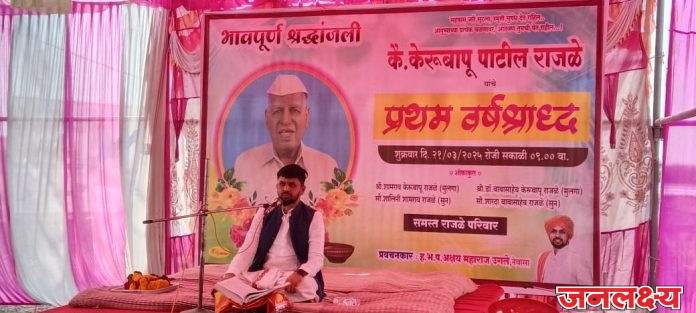 (सुनिल नजन “चिफब्युरो” स्पेशल क्राईम रिपोर्टर अहिल्यानगर जिल्हा) प्रत्येक दशक्रिया विधीच्या वेळी जर कावळा पुर्व दिशेकडून आला आणि पिंडाला शिवला तर मयत झालेला मनुष्य वैकुंठाला गेला, जर तोच कावळा पश्चिम दिशेकडून आला आणि पिंडाला शिवला तर तो मयत मनुष्य स्वर्गाला गेला,जर तोच कावळा दक्षिण दिशेकडून आला आणि पिंडाला शिवला तर तो मयत मनुष्य नरकाला गेला,आणि तोच कावळा उत्तर दिशेकडून आला आणि पिंडाला शिवला तर मयत मनुष्य हा कैलासाला गेला असे समजावे अशी माहिती नेवासा तालुक्यातील जेऊर हैबतीचे रहीवाशी असलेले आणि पारनेर तालुक्यात निवासी असलेले ह.भ.प. अक्षय महाराज उगले यांनी दिली.ते अहिल्यानगर जिल्ह्यातील पाथर्डी तालुक्यातील कासार पिंपळगाव येथे स्वर्गवासी केरुबापू पाटील शंकरराव राजळे यांच्या पुण्यस्मरण सोहळ्या निमित्त आयोजित केलेल्या प्रवचनात संदेश देताना बोलत होते.केरूबापू पाटील राजळे यांनी वयाच्या ८३ व्या वर्षी आपला देह ठेवला होता.त्यांच्या पुण्यस्मरण सोहळ्याचे आयोजन त्यांचे मंत्रालयात मोठे अधिकारी असलेले आणि गावाचे सुपुत्र डॉक्टर बाबासाहेब राजळे आणि संभाजीनगरचे प्रसिद्ध उद्योजक शामसुंदर राजळे व त्यांच्या सुनबाई सौ. शारदाताई राजळे आणि सौ.शालिनीताई राजळे यांनी केले होते. त्या वेळी ह.भ.प. उगले महाराज यांनी रामायण, महाभारतातील अनेक दाखले देऊन उपस्थित श्रोत्यांना मंत्रमुग्ध आणि भावना विवश केले होते.तसेच मुलगी सासरी जाताना बापाची होणारी अवस्था,भाउ आणि बहिणीत संपत्तीच्या वादातून होणारा कलह,भावा भावात जमिनीच्या तुकड्या वरून होणारी भांडणे या सर्व प्रकारच्या गोष्टींना स्पर्श करीत उपस्थित श्रोत्यांना या वादावर पडदा टाकून एकोपा निर्माण करण्यासाठीचे भावनिक आवाहन त्यांनी केले. माणसाचे जीवन हे क्षणभंगुर आहे.प्रत्येकाने उगाचच कोणाशीही वैरभाव न ठेवता आनंदाने जीवन जगण्यासाठी रोज आपल्या ग्रामदेवता, कुलदेवता,पित्रूदेवता व भगवंताचे स्मरण करून आपले विचार बळकट करण्यासाठी प्रयत्न करणे अत्यंत गरजेचे असल्याचे त्यांनी सांगितले.तसेच प्रत्येकाने आपल्या जिवंत असलेल्या आई बाबांची सेवा तर करावीच पण देशाच्या सिमेवर लढणाऱ्या सैनिकांचा आदर करुन त्यांच्या विषयी क्रुतज्ञता बाळगावी असेही सांगितले.उपस्थितांना भाऊंच्या आठवणी सांगताना अनेकांच्या डोळ्यात अश्रू अनावर झाले होते. स्वर्गवासी केरुबापू पाटील राजळे यांना गावातील सर्व लहान थोर मंडळी “भाउ” या नावाने संबोधत असत. काही वर्षांपूर्वी ते गावातील विविध कार्यकारी सोसायटीचे अध्यक्ष ही होते.त्या काळात ते गावातील अनेक लहान मोठे तंटे सोडवत असत.म्हणून गावाने त्यांना पाटीलकी बहाल केली होती.मग ते “केरुबापू पाट