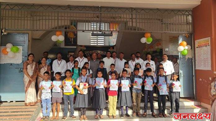 इयत्ता पाचवीच्या विद्यार्थ्यांना पाठ्यपुस्तकांसमवेत गुलाबपुष्प व अल्पोपहार वाटपही करण्यात आले.
