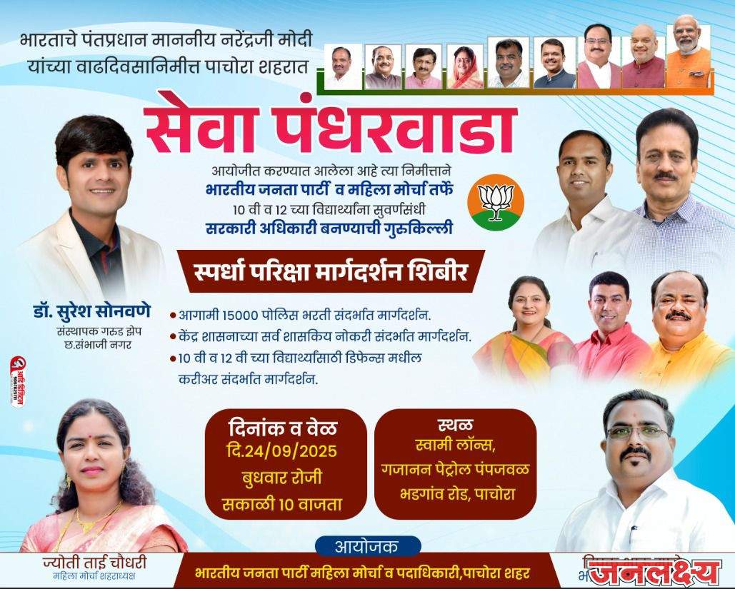 भारताचे पंतप्रधान नरेंद्रजी मोदी यांच्या वाढदिवसानिमित्त येथील भारतीय जनता पार्टी व भाजपा महिला मोर्चा तर्फे बुधवार, दिनांक 24 सप्टेंबर 2025 सकाळी 10 वाजता “स्पर्धा परीक्षा मार्गदर्शन” शिबिराचे आयोजन करण्यात आले आहे. स्वामी लॉन्स, गजानन पेट्रोल पंप शेजारी, पाचोरा येथे हे मार्गदर्शन शिबिर आयोजित केले आहे. या निमित्ताने गरुड झेप अकॅडमी (छत्रपती संभाजी नगर) चे संस्थापक अध्यक्ष डॉ. सुरेश सोनवणे हे इ. 10 वी व 12 वी च्या विद्यार्थ्यांना “सरकारी अधिकारी बनण्याची गुरुकिल्ली” या विषयावर मार्गदर्शन करतील.