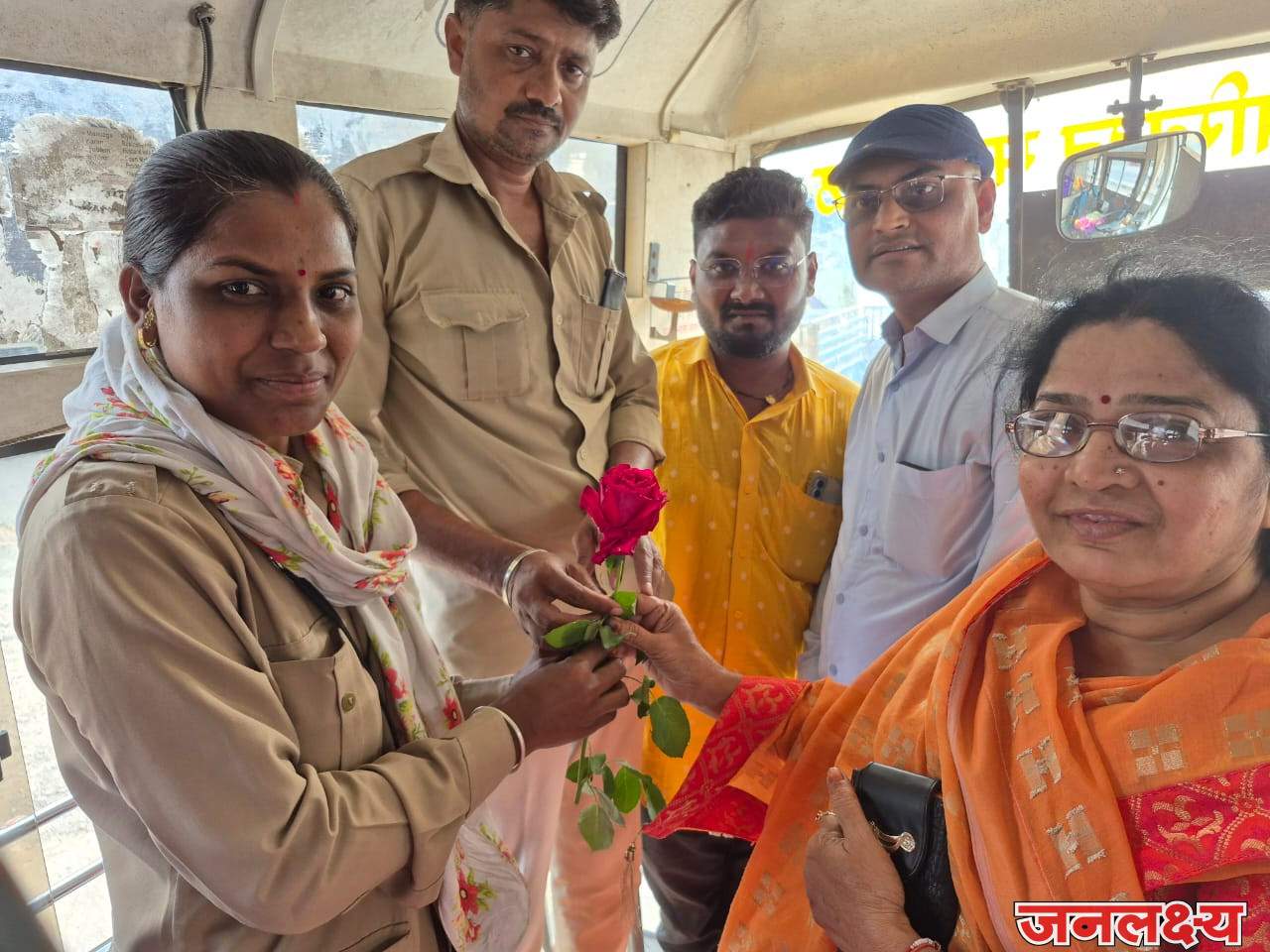 चाळीसगाव महिला कंडक्टर सौ पुनम वैभव सूर्यवंशी यांचे प्रवाशांनी तसेच अखिल भारतीय ग्राहक पंचायत जळगाव जिल्हा आयटीसी सेल प्रमुख शरद गीते , सौ मनीषाताई जाखेटे ,मयूर सुधाकर महाजन मा जिल्हा अध्यक्ष डॉक्टर अनिल देशमुख , यांनी फुलगुच्छ देऊन त्यांचे कौतुक केले, व आभार मानले
