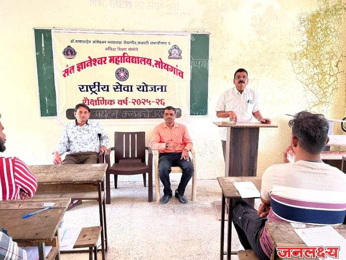 सोयगाव : येथील अजिंठा शिक्षण संस्थेच्या संत ज्ञानेश्वर महाविद्यालयातील राष्ट्रीय सेवा योजना विभागाच्या वतीने 15 नोव्हेंबर २०२५ रोजी पर्यटन क्लबचे उद्घाटन करण्यात आले. यावेळी मंचावर कार्यक्रमाचे अध्यक्ष म्हणून महाविद्यालयाचे प्राचार्य डॉ. शिरीष पवार तर प्रमुख उपस्थिती म्हणून महाविद्यालयातील राज्यशास्त्र विभागाचे प्राध्यापक डॉ. श्रीकृष्ण परिहार आदी मान्यवर उपस्थित होते.