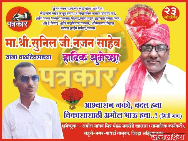 सत्य पत्रकारिता करणं आवश्यक आहे.दिनांक 23 नोव्हेंबर रोजी माझा वाढदिवस होता.आज धकाधकीच्या जीवनात सामाजातील पत्रकारीतेचे नितीमुल्ये जपणाऱ्या अनेक कर्तव्यदक्ष घटकातील सर्व सामान्य व्यक्ती, राजकीय नेते, जनतेचे समाज सेवक,कर्मचारी, अधिकारी, पदाधिकारी, आजी माजी सरपंच,माजी सैनिक, सामाजिक कार्यकर्ते यांनी मोबाईल वर प्रत्यक्ष बॅनर लावून हाॅटसाॅपच्या, फेसबुकच्या माध्यमातून प्रत्यक्ष फोन करून ज्या प्रेमळपणाणे सुबेच्छा दिल्या आणि माझ्या वर जो सुबेच्छांचा वर्षाव करीत विश्वास व्यक्त केला त्या सर्वांचा मी अंतःकरण पूर्वक ऋणी राहीन.तुमच्या सुबेच्छा मुळे मला पत्रकारीता करण्यासाठी अजून ही चांगले बळ मिळाले आहे.मी आयुष्यात जर काही कमावलं असेल तर ते माझं हीत जोपासनारी, सुबेच्छा देणारी तुमच्या सारखी गोड आणि प्रेमळ माणसं या सर्वांचे जाहीर आभार. सुबेच्छांचा वर्षाव करणारे लक्षात राहिलेले हितचिंतक पुढील प्रमाणे ——– जवखेडे खालसा ग्रामपंचायत सदस्य अमोल मतकर, सामाजिक कार्यकर्ते अमोल जाधव,ह.भ.प. भागवत महाराज मरकड,रासपचे पाथर्डी तालुका अध्यक्ष अंकुशराव बोके,शरद म्हस्के, युवा नेते संदिप राजळे यांनी प्रत्यक्ष सुबेच्छांचे बोर्ड बनवून सुबेच्छा दिल्या त्यांचे प्रथम मन:पुर्वक आभार मानतो. मातोश्री लॅबोरेटरी चे डॉक्टर विठ्ठलराव गायकवाड,अप्पासाहेब मंचरे, केदारेश्वर कारखान्याचे मा.व्हा चेरमन सुरेशचंद्र होळकर,पत्रकार अशोक मंडलीक, दिपक धनवटे, वसंतराव नेहुल, संभाजी काजळे,उमेश आव्हाड,रामदास नजन,कोपरे येथील माजी सरपंच रमेश आव्हाड, मारूतराव घुले पाटील,गोपिनाथ माळी, विनोद काजळे,नितीन आव्हाड,पत्रकार अमोलराजे म्हस्के, बद्रीनाथ धोंडे, विष्णू नेहुल, शिवाजी दवणे, प्रविण खंबायत, अरुणदेवा पुंड, सर्जेराव लाटे, नवनाथ तिजोरे,प्रतिक आव्हाड, देविदास नागरगोजे,दिगू वांढेकर,ज्ञानेश्वर आंधळे, प्राध्यापक उत्तमराव राजळे, महेश उघडे, बाबासाहेब खंडागळे,चव्हाण सर,योसेफ शिरसाठ मेजर, एकनाथ नाना वाडगे,पत्रकार अक्षय वायकर, मेजर प्रकाश राजळे,तुकाराम ढाकणे,अनिल कुलकर्णी, अप्पासाहेब वीर,शाम सर, सखाराम खिलारी,राहुल कांबळे,पाथर्डी पंचायत समितीचे माजी सभापती बाळासाहेब अकोलकर,दुसरे माजी सभापती संभाजीराव पालवे,होम,महेश शिंदे,अजित नेहुल,उद्धवराव मतकर,स्टेट बँक युनिटचे संचालक रविंद्र बेरड,राहुल बाबर सर, बाबासाहेब नजन, कैलास अकोलकर, वृक्षमीत्र सुखदेव म्हस्के,शहाजी कोरडकर, ग्रामपंचायत सदस्य संभाजी राजळे, अप्पासाहेब राजळे,गणेश लहुटे,उमेश तिजोरे सर, श्रीकांत माणिकराव भगत पाटील,पत्रकार जनार्दन बोडखे सर,ग्रामसेवक सुधिर शेळके, संतोष तिजोरे, म्हातारदेव शेळके, विष्णू जमधडे, सुधाकर भिसे, देविदास वाकडे, रा