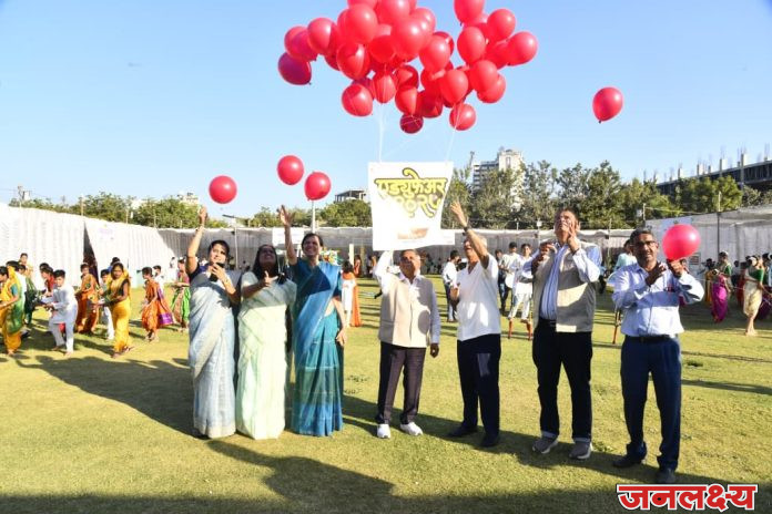 अनुभूती स्कूलच्या एड्युफेअर -२०२५ चे आकाशात फुगे सोडून उद्घाटन करताना डावीकडून रूपाली वाघ, रश्मी लाहोटी, निशा जैन, प्रेम कोगटा, अशोक जैन, अनिश शहा, मनोज दाडकर