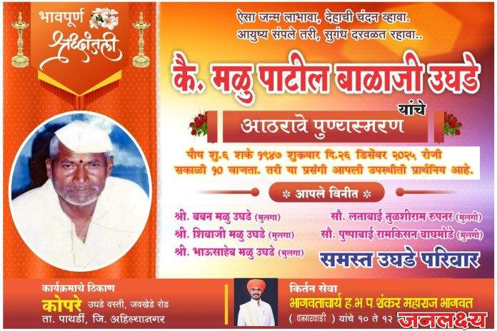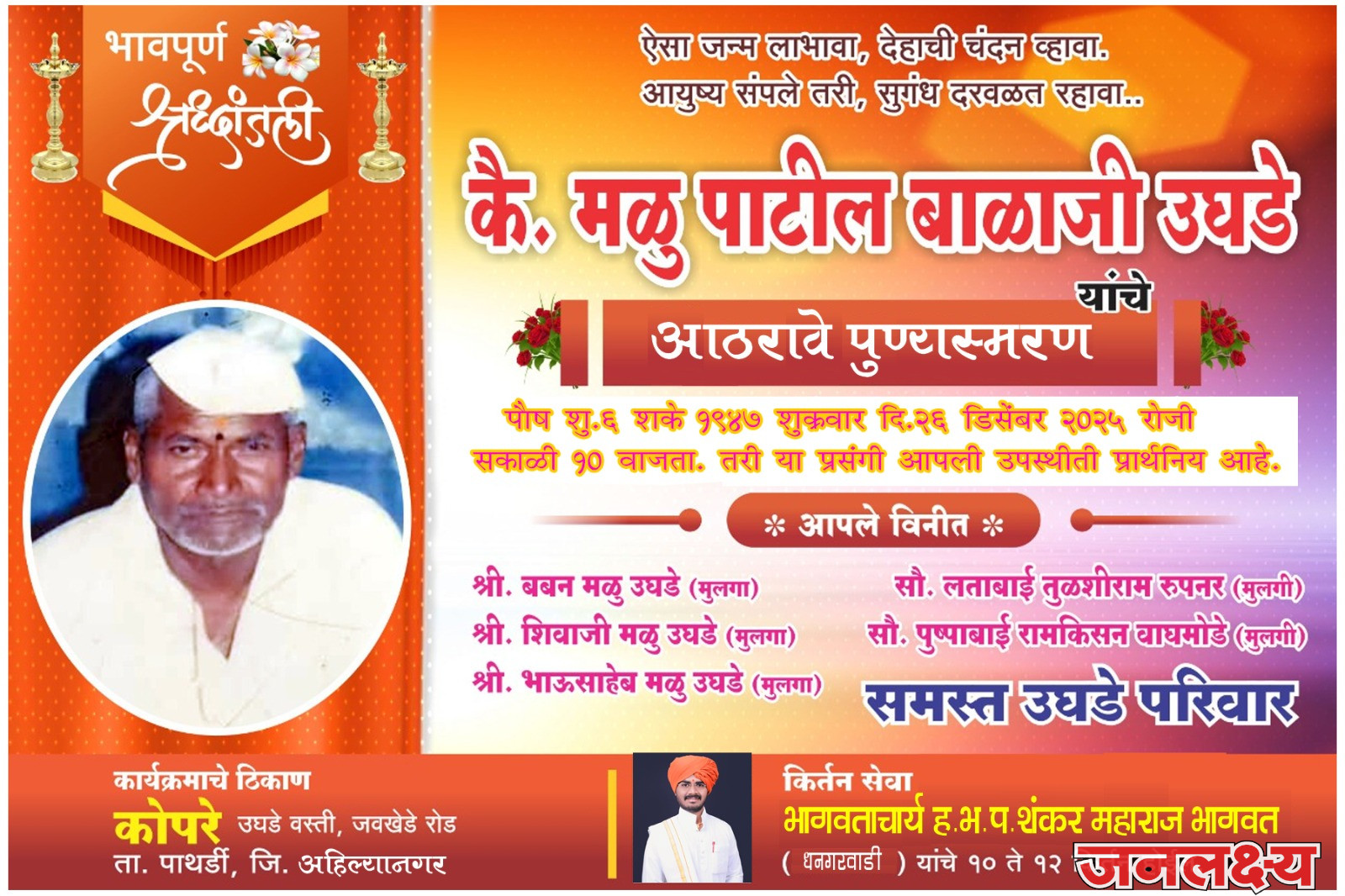 (सुनिल नजन चिफब्युरो स्पेशल क्राईम रिपोर्टर अहिल्यानगर जिल्हा) संपूर्ण आयुष्य भर पोलिस खात्याशी एकनिष्ठ राहिलेले अहिल्यानगर जिल्ह्यातील पाथर्डी तालुक्यातील कोपरे गावचे माजी पोलीस पाटील स्व.मळूपाटील बाळाजी उघडे यांच्या अठराव्या पुंण्य स्मरणा निमित्ताने श्री दुर्गाशंकर मल्टीस्टेट को ऑपरेटीव्ह सोसायटीच्या दिनदर्शिकेचा प्रकाशन सोहळा युवा नेते कृष्णा राजीव राजळे यांच्या हस्ते मोठ्या उत्साहात कोपरे येथे संपन्न झाला.धनगर वाडीचे ह.भ.प. भागवताचार्य शंकर महाराज भागवत यांनी उपस्थित श्रोत्यांना मंत्रमुग्ध केले. त्यांनी महाभारता तील कथा सांगून अनेकांची मने जिंकून घेतली.जवखेडे येथील ह.भ.प. बाबासाहेब महाराज मतकर यांचे ते पट्ट शिष्य होते.स्व. मळूपाटील उघडे यांनी वीस वर्षे कोपरे गावचे पोलिस पाटील म्हणून काम केले होते.गेली अठरा वर्षे झाली सातत्याने दरवर्षी त्यांचा हा पुण्यस्मरण सोहळा संपन्न होत आहे.आजकाल समाजात स्वतःला प्रतिष्ठीत म्हणून घेणाऱ्या काही औलादी या जिवंतपणी आपल्या आई वडिलांना सांभाळत नाहीत ही खरी आजची वस्तुस्थिती आहे. परंतु उघडे पाटील परीवारातील भाऊसाहेब उघडे, बबनराव उघडे, शिवाजीराव उघडे यांनी गेली अठरा वर्षे झाली आपल्या स्वर्गीय वडीलांचा पुण्यतिथी सोहळा दरवर्षी मोठ्या उत्साहात साजरा करून आपल्या वडीलांना खरी आदरांजली अर्पण केली आहे.ही उघडे घराण्याची आजपर्यंतची थोर परंपरा आहे.श्री दुर्गाशंकर मल्टीस्टेट को ऑपरेटीव्ह क्रेडिट सोसायटीचे चेरमन पोपटराव पडोळे आणि सचिव मारूती दगडखैर साहेब यांच्या समन्वयातून या नवीन वर्षाच्या दिनदर्शिका प्रकाशन सोहळ्याचे आयोजन करण्यात आले होते.भाजपचे नेवासा तालुक्यातील नेते अशोकराव कोळेकर,विखे पाटील घराण्याचे खंदे समर्थक राजूममामा तागड, वाघोली सोसायटीचे चेरमन पांडुरंग दातीर,आदिनाथ नागरी पतसंस्थेचे व्हाईस चेरमन बाबासाहेब बर्डे,कोपरे गावचे माजी सरपंच रमेशराव आव्हाड, हनुमान टाकळी सोसायटीचे माजी चेरमन अशोकराव काजळे,वडुले खुर्द येथील ह.भ.प. नवनाथ महाराज आव्हाड,मीरीचे महादेव कुटे पाटील,माका येथील भाजपा नेते संभाजीराव लोंढे,निलेश महानवर,यांच्या हस्ते हा प्रकाशन सोहळा संपन्न झाला.या प्रसंगी हनुमान टाकळी सोसायटीचे संचालक संजय बर्डे,अण्णासाहेब बर्डे,अशोक बर्डे,माजी संचालक संभाजी दगडखैर,सचिव बाळासाहेब ताठे, विनोद खंबायत, वाघोली दुधडेअरीचे चेरमन दत्तात्रय दातीर, सोसायटीचे माजी चेरमन सुभाष दातीर,कोपरे ग्रामपंचायत सदस्य शंकरराव उघडे,मंगल वाघमोडे,दिपक धनवटे,आडगाव येथील तंटामुक्त समितीचे अध्यक्ष सुखदेव शेंडे,मळू बोरूडे,अर्जुन आंधळे, रामकिसन आंधळे,वसंतराव आव्हाड,चारूदत वाघ,वैभव आंधळे,यांच्या