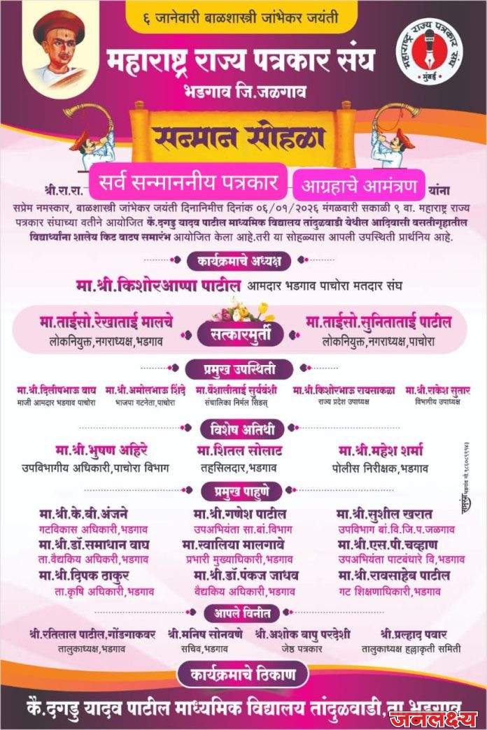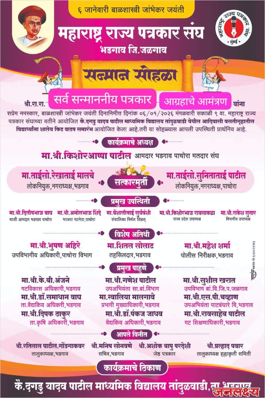 तांदुळवाडी ता.भडगाव येथील कै. यादव दगडू पाटील माध्यमिक विद्यालय तांदुळवाडी येथे बाळशास्त्री जांभेकर यांच्या जयंतीनिमित्ताने पत्रकार दिनी दि. ०६/०१/२०२६ मंगळवार सकाळी ठीक १०.०० वाजता सन्माननीय अध्यक्ष, राज्य प्रदेश उपाध्यक्ष किशोर भाऊ रायसाकडा, विभागीय उपाध्यक्ष श्री. राकेश सुतार, यांच्या आदेशावरून महाराष्ट्र राज्य पत्रकार संघाचे तालुकाध्यक्ष रतिलाल पाटील गोंडगावकर यांच्या मार्गदर्शनाखाली माध्यमिक विद्यालय तांदुळवाडी येथे विद्यार्थ्यांना शालेय किट वाटप समारंभ आयोजित केलेला आहे.