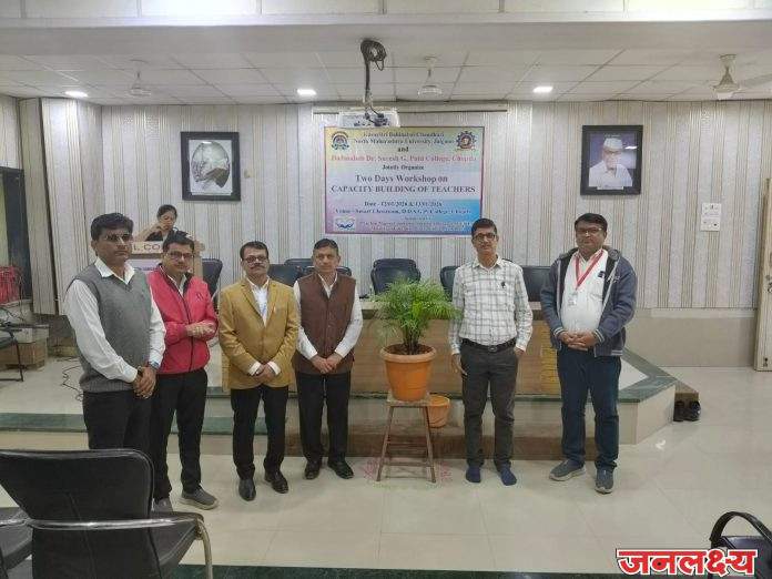 चोपडा : कवयित्री बहिणाबाई चौधरी उत्तर महाराष्ट्र विद्यापीठ, जळगाव पीएम -उषा, नवी दिल्ली अंतर्गत तसेच अंतर्गत गुणवत्ता हमी कक्ष (IQAC) महात्मा गांधी शिक्षण मंडळाचे दादासाहेब डॉ. सुरेश जी. पाटील महाविद्यालय चोपडा यांच्यातर्फे  ‘Capacity Building of Teachers’ या विषयावर आधारित दोन दिवसीय कार्यशाळेचे यशस्वी आयोजन करण्यात आले होते. या कार्यशाळेच्या सुरुवातीला माजी शिक्षणमंत्री कै.मा.ना.अक्कासो.सौ.शरच्चंद्रिका सुरेश पाटील तसेच संस्थेचे संस्थापक अध्यक्ष कै. दादासाहेब डॉ.सुरेश जी.पाटील यांच्या प्रतिमेला माल्यार्पण करून तसेच वृक्षपूजन, वृक्ष जलार्पण करून कार्यक्रमाची सुरुवात करण्यात आली.