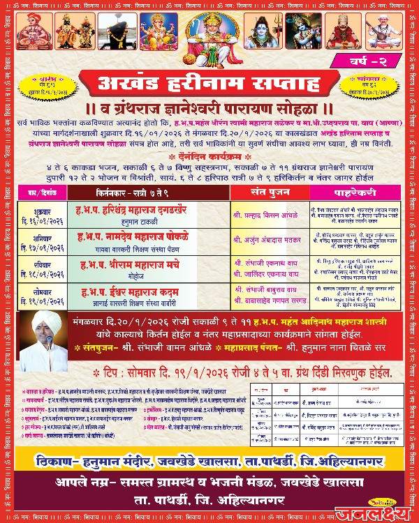 वृद्धेश्वर साखर कारखान्याचे माजी चेरमन व जेष्ठ नेते उद्धवराव वाघ यांच्या मार्गदर्शनाखाली आणि ह.भ.प.श्रीरंग महाराज तळेकर यांच्या अधिपत्या खाली १६ ते २० जानेवारी २०२६ या कालावधीत अखंड हरिनाम सप्ताहाचे आयोजन करण्यात आले आहे. हनुमान,शनि, गणपती मंदिराच्या दुसऱ्या वर्धापन दिनानिमित्त हा अखंड हरिनाम सप्ताह आयोजित करण्यात आला आहे.वरील कालावधीत दररोज पहाटे काकडा भजन,सकाळी, विष्णू सहस्त्रनाम,ग्रंथ वाचन,हरीपाठ, हरी किर्तन,हरीजागर या प्रमाणे कार्यक्रमाची रूपरेषा ठरविण्यात आली आहे.सर्व ह.भ.प. हरीश्चंद्र महाराज दगडखैर,नामदेव महाराज पोकळे,श्रीराम महाराज मचे, ईश्वर महाराज कदम,यांची किर्तने होणार आहेत.या कालावधीत दररोज मतकर,घाटुळ, आंधळे,वाघ, सरगड,देशमुख, शिंदे,धनवडे परीवाराच्या वतीने अन्नदान करण्यात येणार आहे. दिनांक २० जानेवारी २०२६ रोजी सकाळी तारकेश्वर गडांचे महंत आदिनाथ महाराज शास्त्री यांचे काल्याचे किर्तन होउन नंतर हनुमान नाना चितळे सर यांच्या काल्याच्या महाप्रसादाच्या पंगतीने या सोहळ्याची सांगता होणार आहे.तरी पंचक्रोशीत भाविकांनी या सोहळ्यास आवर्जून उपस्थित रहावे असे आवाहन समस्त ग्रामस्थ व भजनी मंडळ जवखेडे खालसा यांच्या वतीने करण्यात आले आहे.