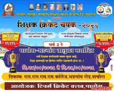 पाचोरा तालुका सहकारी शिक्षण संस्थेचे चेअरमन आदरणीय नानासो.संजयजी वाघ यांच्या संकल्पनेतून पाचोरा- भडगाव तालुक्यातील सर्व शिक्षक एकत्र यावेत.क्रिकेट खेळाडूंना आपल्या खेळीची संधी मिळावी यासाठी शिक्षक क्रिकेट चषक 2026 पर्व 3 रे पाचोरा तालुका सहकारी शिक्षण संस्था पाचोरा जिल्हा जळगाव यांच्या वतीने आयोजिलेले आहे.आयोजित शिक्षक क्रिकेट चषक 2026 पर्व तिसरे दिनांक -24 जानेवारी ते 26 जानेवारी रोजी एस. एस. एम. एम. कॉलेज मैदान पाचोरा येथे आयोजित करण्यात आलेला असून स्पर्धेचे उद्घाटन समारंभ गुरूवार दिनांक 24/01/2026 रोजी दुपारी 12 वाजता होणार आहे. या क्रिकेट स्पर्धेत 16 संघ व 208 खेळाडू सहभागी होणार आहेत.आपण जास्तीत जास्त उपस्थिती देऊन शिक्षक क्रिकेट खेळाडूंचा उत्साह वाढवावा असे संस्थेचे म.अध्यक्ष,म. चेअरमन, म.मानद सचिव, म.व्हाईस चेअरमन , संचालक मंडळ व टिचर्स क्रिकेट क्लब,पाचोरा यांनी कळविलेले आहे.