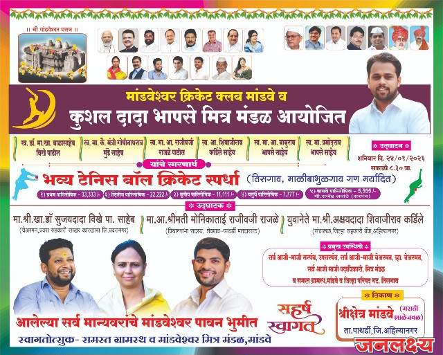 साऱ्या विश्वाला खेळाचे वेड लावून गोल मैदानावर खेळ खेळत सर्व जगाला काखेत घेतलेल्या क्रिकेट या खेळाचा अहिल्यानगर जिल्ह्यातील पाथर्डी तालुक्यातील मांडवे येथे शानदार उद्घाटन सोहळा संपन्न झाला.शेवगाव पाथर्डी विधानसभा मतदार संघाच्या भाजपच्या हॅट्ट्रिक आमदार मोनिकाताई राजळे यांच्या हस्ते या खेळाचे उद्घाटन संपन्न झाले.मांडवेश्वर क्रिकेट क्लब आणि कुशलदादा भापसे मित्र मंडळ यांच्या संयुक्त विद्यमाने या क्रिकेट स्पर्धेचे पाथर्डी तालुक्यातील मांडवे येथे आयोजन करण्यात आले आहे.माजी खासदार स्वर्गिय बाळासाहेब विखे पाटील,माजी केंद्रीय मंत्री नामदार गोपिनाथराव मुंडे साहेब,माजी आमदार स्व.राजीवजी राजळे,माजी आमदार स्व.शिवाजीराव कर्डिले साहेब, माजी आमदार बाबुरावजी भापसे,स्व.प्रमोद भापसे पाटील यांच्या स्मृतिप्रीत्यर्थ या क्रिकेट स्पर्धेचे आयोजन करण्यात आले आहे.फक्त तिसगाव जिल्हा परिषद गटातील,माळी बाभुळगाव गण व तिसगाव गणातील क्रिकेट संघांनाच या क्रिकेट स्पर्धेत सहभागी होता येणार आहे.पहिले बक्षीस ३३,३३३ रूपये, दुसरे बक्षीस २२,२२२ रूपये,तिसरे बक्षीस ११,१११ रुपये,चौथे बक्षीस ७,७७७ रूपये,पाचवे बक्षीस ५,५५५ रूपये ठेवण्यात आले आहे.त्या सोबतच विजयी संघांना ट्राॅफीही देण्यात येणार आहे.प्रथम नारळ फोडून या स्पर्धेचा बलून हवेत सोडण्यात आला.नंतर आमदार मोनिकाताई राजळे आणि युवा नेते कुशल भापसे यांनी जोरदार षटकार मारून या क्रिकेट स्पर्धेचे उद्घाटन केले.आगामी जिल्हा परिषद निवडणूक डोळ्यासमोर ठेवून निवडणुकीची फलंदाजी करण्या आधीच ही क्रिकेटची फलंदाजी करत नेत्यांनी जोरदार षटकार बाजी केली आहे. तिसगाव जिल्हा परिषद गटात महायुती तर्फे फलंदाजी करताना विरोधकांचा त्रिफळा उडवण्या साठी ही आगामी राजकीय रणनीती सुरू झाली आहे. आगामी जिल्हा परिषद निवडणूकी विषयी विरोधी गटात सामसूम असतानाच महायुतीची मात्र जोरदार फलंदाजी सुरू झाली आहे. या उद्घाटना प्रसंगी तिसगाव येथील नेते विक्रममामा ससाणे यांनी कुशल भापसे यांची “भावी जिल्हा परिषद सदस्य”म्हणून घोषणाच करून टाकली आणि तिसगाव जिल्हा परिषद गटात महायुती तर्फे निवडणूकीचे अप्रत्यक्ष रित्या रणशिंगच फुंकले आहे.तिसगाव जिल्हा परिषद गटात युवा नेते कुशल भापसे नेमका कोणाचा त्रिफळा उडवणार हे मात्र अजूनही गुलदस्त्यातच आहे.तिसगाव जिल्हा परिषद गटात महायुतीच्या उमेदवारीची चर्चा सुरू झाली आहे.तो पर्यंत “भापसे सेनेने” प्रचाराची पहीली फेरी पूर्ण केली आहे.तिसगाव जिल्हा परिषद गटातील भापसे सेनेची कामगिरी पाहता महायुतीच्या पक्षश्रेष्ठींना निश्चितच उमेदवारी साठी विचार करायला लावणारी गोष्ट निर्माण झाली आहे.जिल्हा परिषद निवडणुकी