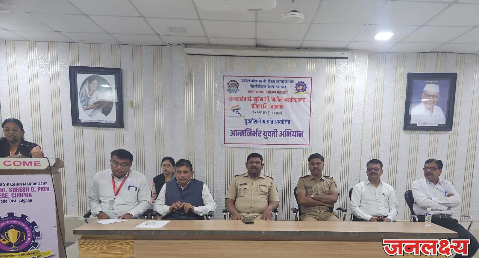 चोपडा: महात्मा गांधी शिक्षण मंडळाचे दादासाहेब डॉ. सुरेश जी. पाटील महाविद्यालय, चोपडा येथील विद्यार्थी विकास विभाग व कवयित्री बहिणाबाई चौधरी उत्तर महाराष्ट्र विद्यापीठ, जळगाव यांच्या संयुक्त विद्यमाने महाविद्यालयातील विद्यार्थिनींसाठी आत्मनिर्भर युवती अभियान दिनांक २ ते ७ फेब्रुवारी २०२६ या कालावधीत राबविण्यात येत आहे.या अभियानांतर्गत दिनांक ६ फेब्रुवारी २०२६ रोजी सध्याच्या डिजिटल युगात वाढत चाललेल्या सायबर गुन्ह्यांच्या पार्श्वभूमीवर विद्यार्थ्यान मध्ये जागरूकता निर्माण करण्यासाठी विशेष जनजागृती कार्यक्रमाचे आयोजन करण्यात आले होते.