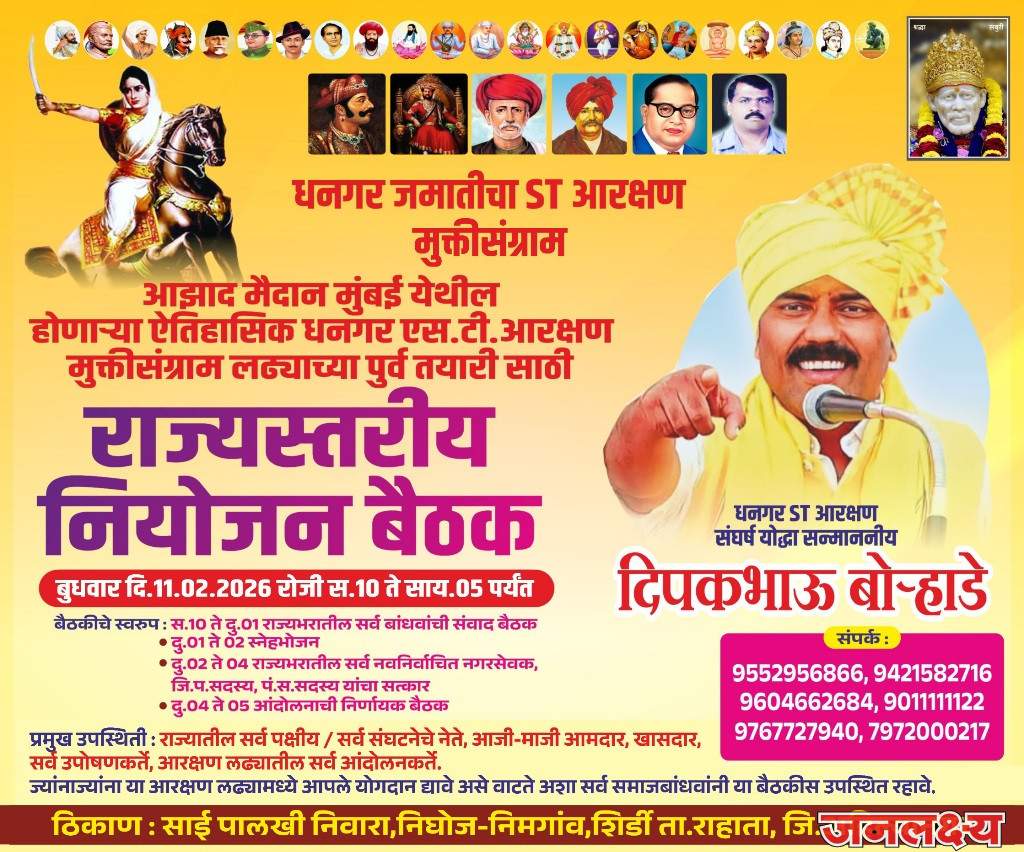 संपूर्ण महाराष्ट्र राज्या मध्ये धनगर समाज एसटी आरक्षण लढा उभारण्या साठी दिपक बोर्हाडे यांच्या नेतृत्वाखाली शिर्डी येथील होणाऱ्या राज्यव्यापी बैठकीस उपस्थित राहावे असे आवाहन विजय तमनर यांनी राज्यातील सर्व धनगर समाज बांधवांना केले आहे.गेल्या सत्तर वर्षांपासून अनेक पक्षांच्या नेत्यांकडून धनगर सामाजातील जमातीचा एस टी आरक्षण अंमल बजावणी साठीचा मुद्दा हेतुपूर्वक प्रलंबित ठेवण्यात आला आहे. भारतरत्न डॉ बाबासाहेब आंबेडकर यांनी धनगर समाजाला घटनेतच ३६ क्रमांकावर आरक्षण दिलेले आहे.मात्र आतापर्यंत होउन गेलेल्या आणि आता सत्तेवर असलेल्या माजी आजी सर्व सरकार कडून त्याची अंमल बजावणी झालेली नाही.धनगर समाजाला नुसती पोकळ आश्वासने दिली गेली आहेत.या अंमल बजावणी साठी धनगर समाजातील सर्व स्तरातील घटकांना सोबत घेऊन सातत्याने संघर्ष करणारे मल्हारयोध्दे दिपकभाऊ बोऱ्हाडे यांची शिर्डी येथील साईपालखी निवारा येथे दिनांक ११ फेब्रुवारी रोजी एक बैठक संपन्न होत आहे. आगामी काळात भविष्यात धनगर समाजावर होणाऱ्या अंन्याय अत्याचार,प्रखर, तीव्र स्वरूपाच्या आंदोलनाच्या पार्श्वभूमीवर या बैठकीत विचार विनिमय होणार आहे.ही बैठक धनगर समाजाचे महाराष्ट्र राज्यातील सर्व उपोषणकर्ते, आंदोलक, सामाजिक कार्यकर्ते, नवनिर्वाचित नगरसेवक, जिल्हा परिषद सदस्य, आजी, माजी पदाधिकारी तसेच धनगर समाजातील सर्व स्तरातील प्रतिनिधी यांच्या उपस्थितीत दि.११ फेब्रुवारी २०२६ रोजी सकाळी १० ते ५ या वेळेत संपन्न होत आहे. या बैठकीत आगामी धनगर जमातीचा एस टी आरक्षण मुक्ती संग्रामाचा राज्य व्यापी लढा आणि मुंबई येथे होणाऱ्या राज्यव्यापी आंदोलनाच्या अनुषंगाने चर्चा होणार आहे.तसेच या बैठकीत प्रामुख्याने आझाद मैदान मुंबई येथील होणाऱ्या ऐतिहासिक धनगर समाज एसटी आरक्षण मुक्तिसंग्राम लढ्याची संपुर्ण तयारी या संदर्भातही चर्चा होणार असून संपुर्ण महाराष्ट्र राज्यातील धनगर समाजातील सर्व लहान थोर विचारवंतांनी या बैठकीला उपस्थित रहावे असे आवाहन श्री.विजय तमनर यांनी संयोजन समितीच्या वतीने केले आहे. महाराष्ट्र राज्यात कोण कुठे काय करतोय याकडे कटाक्षाने लक्ष न देता याच प्रमुख बैठकीस सर्वांनी उपस्थित राहावे असे समाजातील बांधवांना कळविण्यात आले आहे.या बैठकीस उपस्थित राहण्यासाठी राज्यातील कोणत्याही कार्यकर्त्यांला काही अडचण असल्यास त्यांनी 9552956866,9421582716, 9604662684,9011111122, 9767727940, 79720000217या नंबर वर संपर्क साधावा असेही कळविण्यात आले आहे.