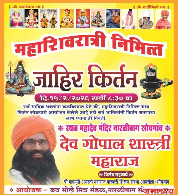 तरी सर्व ग्रामस्थ, शिवभक्त व भाविकांनी मोठ्या संख्येने उपस्थित राहून कीर्तनाचा लाभ घ्यावा व कार्यक्रमाची शोभा वाढवावी, असे नम्र आवाहन आयोजकांकडून जय भोले मित्र मंडळ नारळीबाग सोयगाव करण्यात येत आहे.