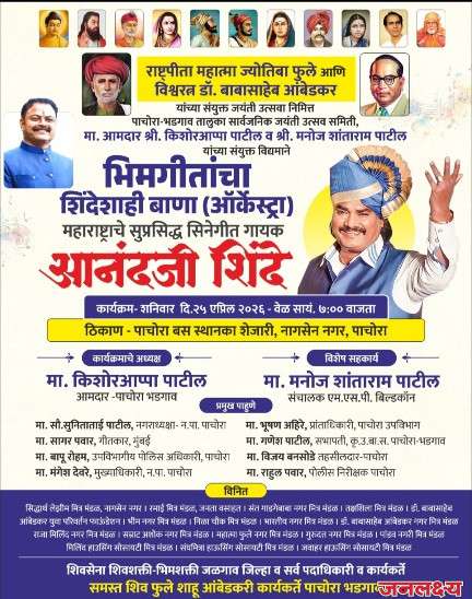 पाचोरा : राष्ट्रपिता महात्मा ज्योतिबा फुले आणि विश्वरत्न डॉ. बाबासाहेब आंबेडकर यांच्या संयुक्त जयंतीनिमित्त पाचोरा-भडगाव तालुका सार्वजनिक जयंती उत्सव समितीच्या वतीने भव्य कार्यक्रमाचे आयोजन करण्यात आले आहे. या निमित्ताने महाराष्ट्रातील सुप्रसिद्ध सिनेगीत गायक आनंद शिंदे यांच्या “भिमगीतांचा झंकार (ऑर्केस्ट्रा)” या विशेष कार्यक्रमाचे आयोजन करण्यात आले आहे.