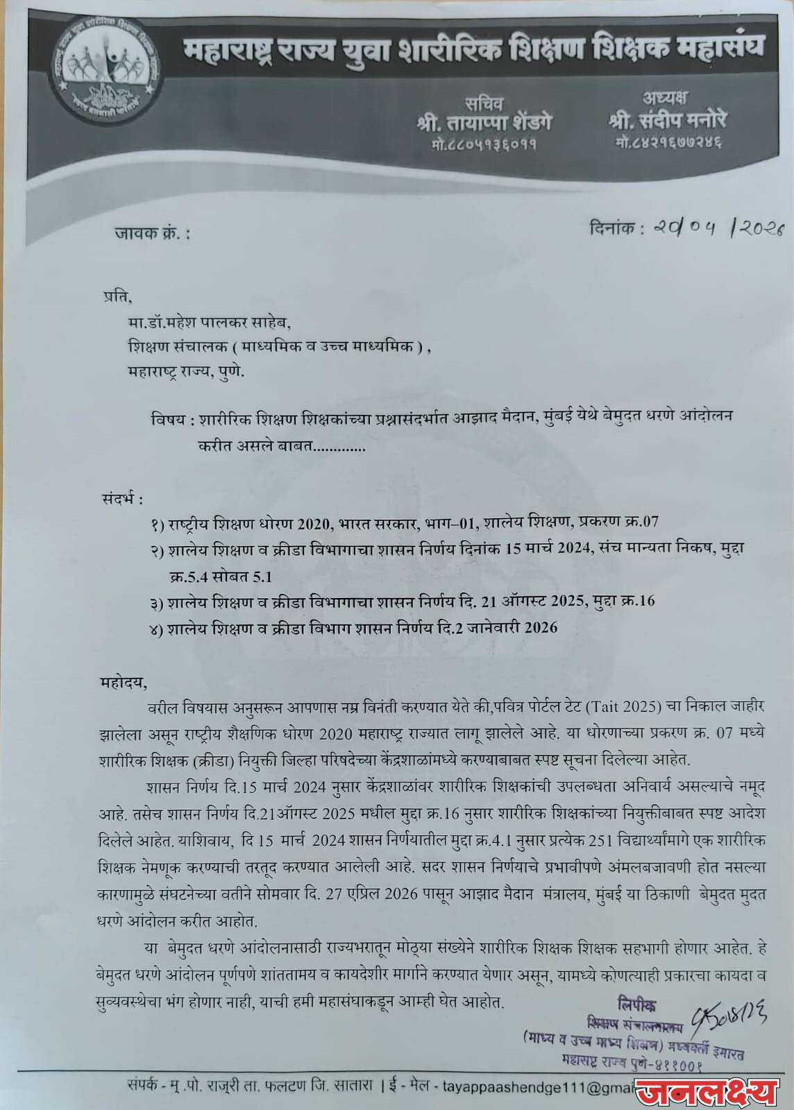 शारीरिक शिक्षण शिक्षकांचे आझाद मैदान मुंबई या ठिकाणी दि. 27 एप्रिल 2026 रोजी पासून बेमुदत धरणे आंदोलन