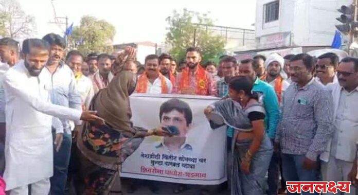 मागणी साठी पाचोरा शिवसेनेतर्फे निवेदन देण्यात आले.यावेळी खा.सोमय्या यांचे छायाचित्र असलेल्या बॅनर ला महिला पदाधिकाऱ्यांकडून चपलांचा चोप देण्यात आला तसेच त्यांच्या पुतळ्याचे दहन करण्यात आले.