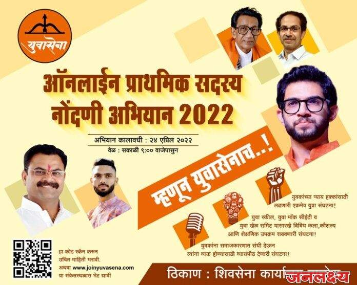 आदित्य साहेब ठाकरे यांच्या आदेशाने,सचिव वरूनजी सरदेसाई यांच्या मार्गदर्शनाखाली राज्यभर ऑनलाइन प्राथमिक सदश्यता नोंदणी अभियान सुरू आहे.याचाच भाग म्हणून पाचोरा युवासेना तर्फे शहरात व ग्रामीण भागात सदश्यता नोंदणी अभियान उपक्रम राबवण्यात येणार आहे.शहरात २६ एप्रिल ,मंगळवार रोजी सकाळी ठीक 10 ते 1 यावेळी महाराणा प्रताप चौक व शिवसेना मध्यावर्ती कार्यालय या दोन ठिकाणी नोंदणी करण्यात येईल.सदर नोंदणी ऑनलाइन असल्यामुळे बॅनर वरील QR कोड स्कॅन करून किंवा www.joinyuvasena.com.या लिंक वर जाऊन पण आपण सदश्य होऊ शकतात.सदश्य झाल्यावर आपल्याला लागलीच आदित्य साहेबांच्या सही चे ओळख पत्र ऑनलाइन डाउनलोड करता येईल .युवासेना ही युवकांच्या प्रश्नांवर काम करणारी ,त्यांच्या न्याय हक्कासाठी लढणारी एकमात्र संघटना आहे,युवकांना समाजकारणात संधी देऊन त्यांना व्यक्त होण्यास व्यासपीठ देणारी संघटना आहे, विविध कला कौशल्य,शैक्षणिक उपक्रम राबवणारी संघटनाआहे ,समाजाचं ही काही देणं लागत या हेतूने जास्तीत जास्त युवकांनी सहभाग घ्यावा व विकासात्मक,सकारात्मक राष्ट्रनिर्मिती मध्ये आपले योगदान द्यावे .