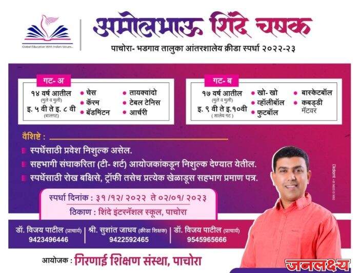 पाचोरा- येथील गिरणाई शिक्षण संस्था तर्फे दिनांक 31 डिसेंबर 2022 ते 2 जानेवारी 2023 दरम्यान “अमोल भाऊ शिंदे चषक” अंतर्गत विविध विविध शालेय क्रीडा स्पर्धांचे आयोजन करण्यात आले आहे. शिंदे इंटरनॅशनल स्कूल च्या भव्य पटांगणावर या स्पर्धा होणार आहेत.