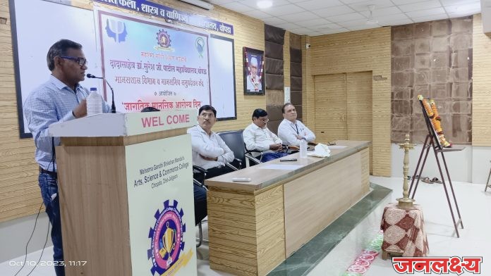 चोपडा: येथील महात्मा गांधी शिक्षण मंडळाचे, दादासाहेब डॉ. सुरेश जी. पाटील महाविद्यालयातील मानसमित्र समुपदेशन केंद्र व मानसशास्त्र विभाग यांच्यातर्फे ‘जागतिक मानसिक आरोग्य दिनानिमित्त’ व्याख्यान व ‘पोस्टर प्रदर्शन’ कार्यक्रमाचे आयोजन करण्यात आले होते. यावेळी मान्यवरांच्या हस्ते महाराष्ट्र राज्याच्या माजी शिक्षणमंत्री कै.मा.ना.अक्कासो.सौ. शरच्चंद्रिका सुरेश पाटील यांच्या प्रतिमेला माल्यार्पण करून तसेच दीपप्रज्वलन करून या कार्यक्रमाचे उदघाटन करण्यात आले.